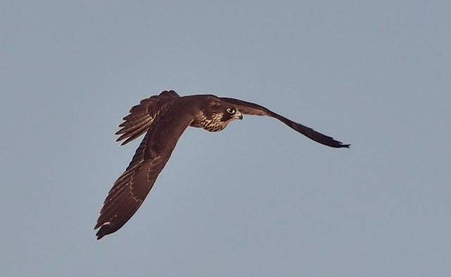 The falcon would chase the flock of pigeons, circling them from the outside, into a ball of pigeon panic. After three or four circuits the falcon would leave without making a strike. From the look of his full craw, I don't think he was hungry, but just bored.